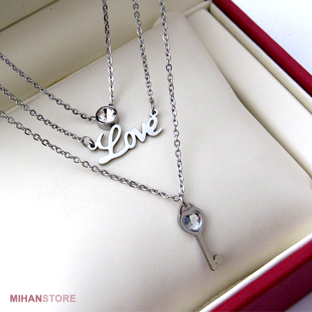 این نیم ست فوق العاده زیبا دارای گردنبندی سه زنجیره با پلاک های نگین درشت،Love و کلید می باشد که سه زنجیر در انتها یکی شده و به راحتی با یک قفل به گردن شما آویخته می شود. از این رو بستن آن فوق العاده آسان و جلوه و نمای آن فوق العاده چشم گیر و مورد پسند افراد شیک پوش و خواستار تمایز می باشد. این نیم ست دارای دو گوشواره طرح کلید است که تکمیل کننده زیبایی گردنبند می باشد.