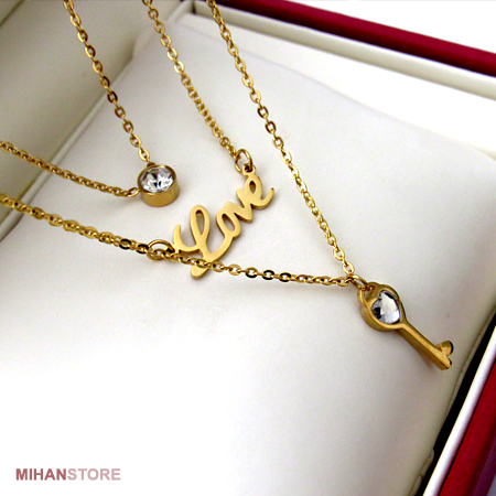 دارای گردنبند سه زنجیره با آویز های نگین، Love و کلید